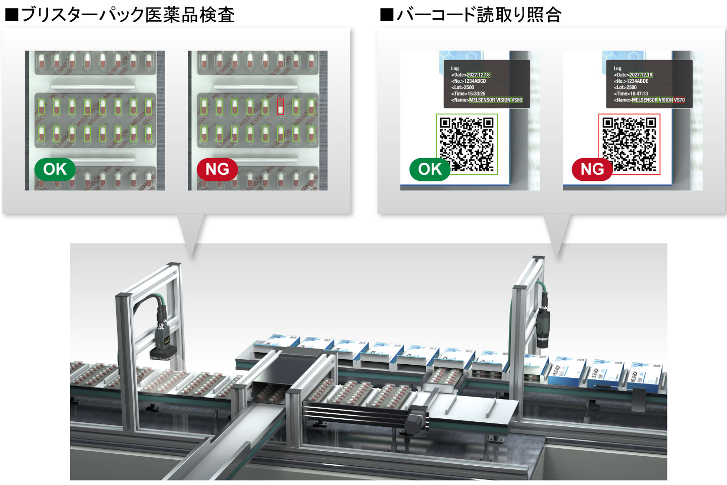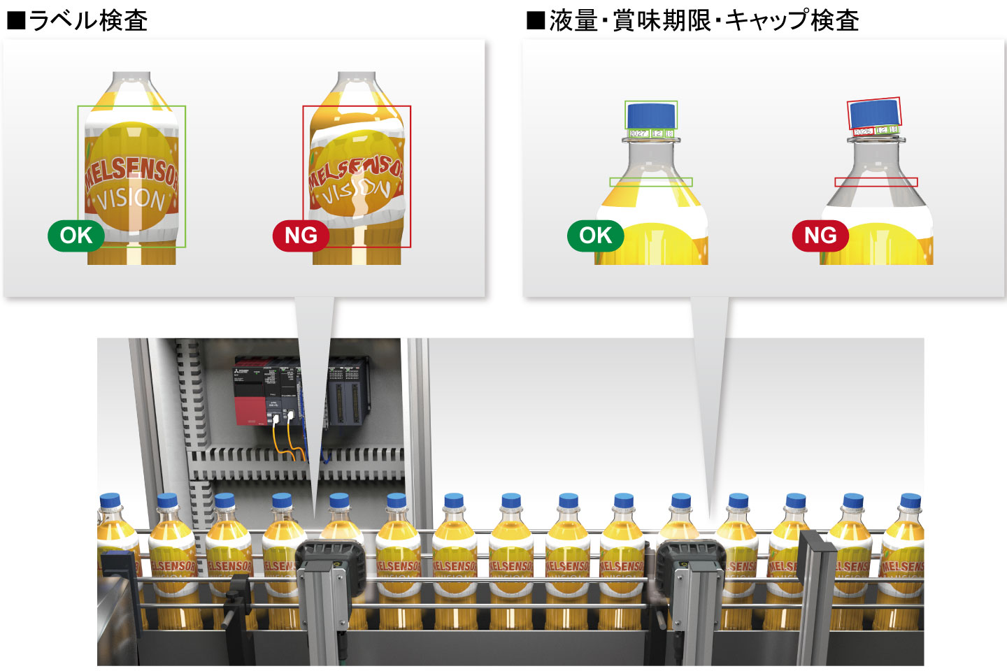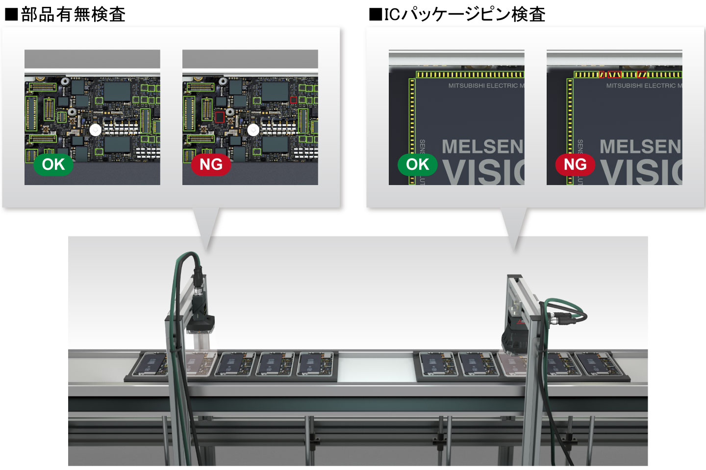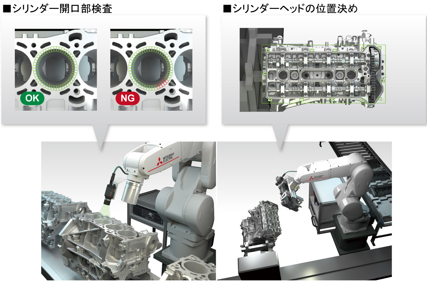 ビジョンセンサの導入により、様々なワークの位置決め、有無検査、寸法測定などが行えます。