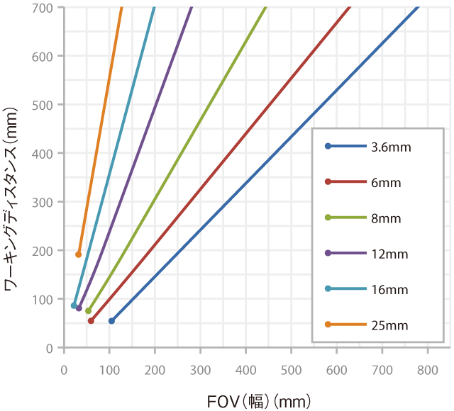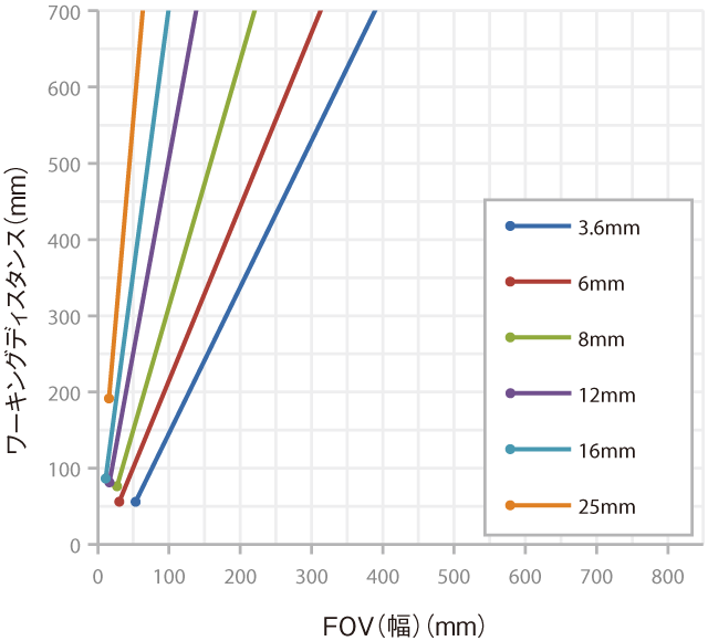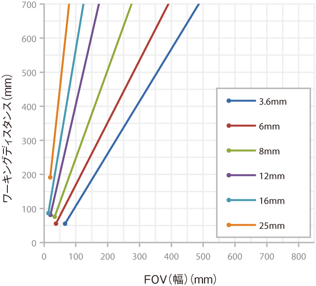 レンズから検査対象物までの距離をワーキングディスタンスと呼び、ビジョンセンサがその距離で見られる領域を視野と呼びます。以下のグラフを参考に、視野に合わせてワーキングディスタンスやレンズを選択してください。