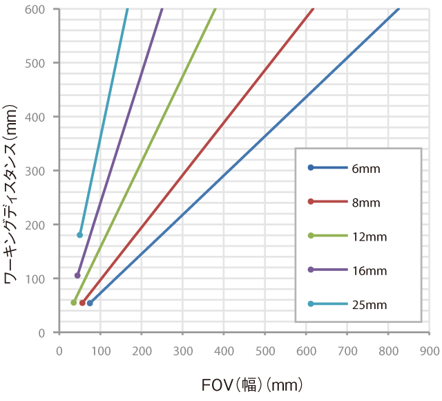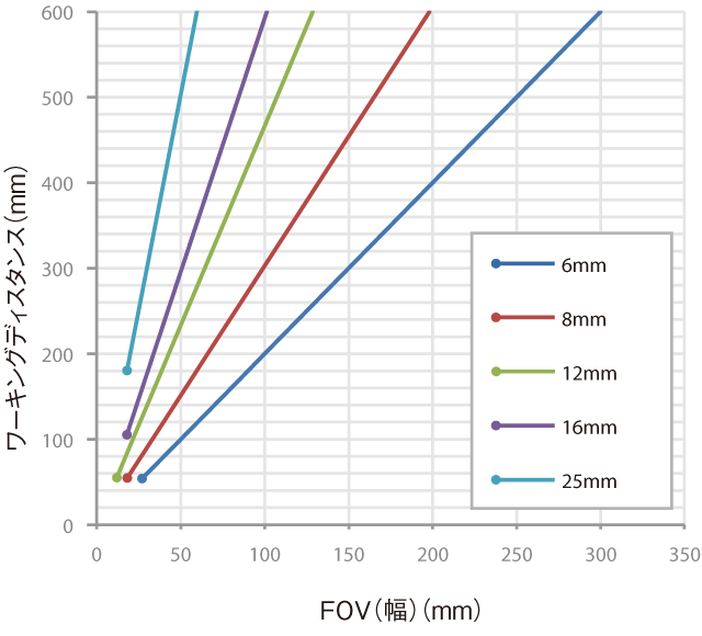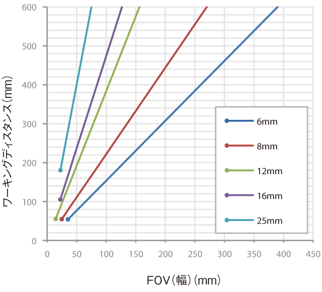 レンズから検査対象物までの距離をワーキングディスタンスと呼び、ビジョンセンサがその距離で見られる領域を視野と呼びます。以下のグラフを参考に、視野に合わせてワーキングディスタンスやレンズを選択してください。