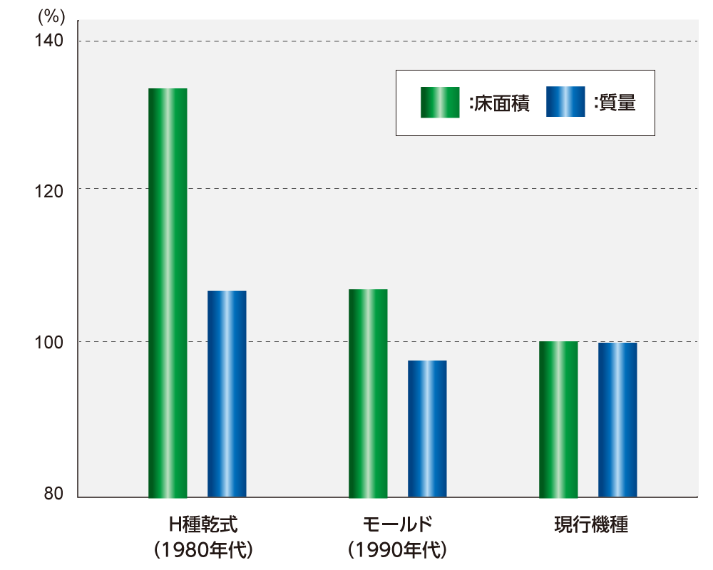 磁束密度の最適化により変圧器運転騒音の低減実現し省エネと低騒音化を両立させ、騒音レベルの基準値※1に対して6dBの低騒音化を実現しました。 - 2.省スペース・軽量設計