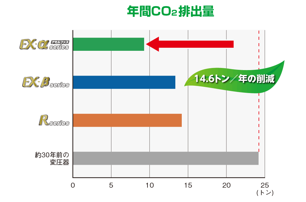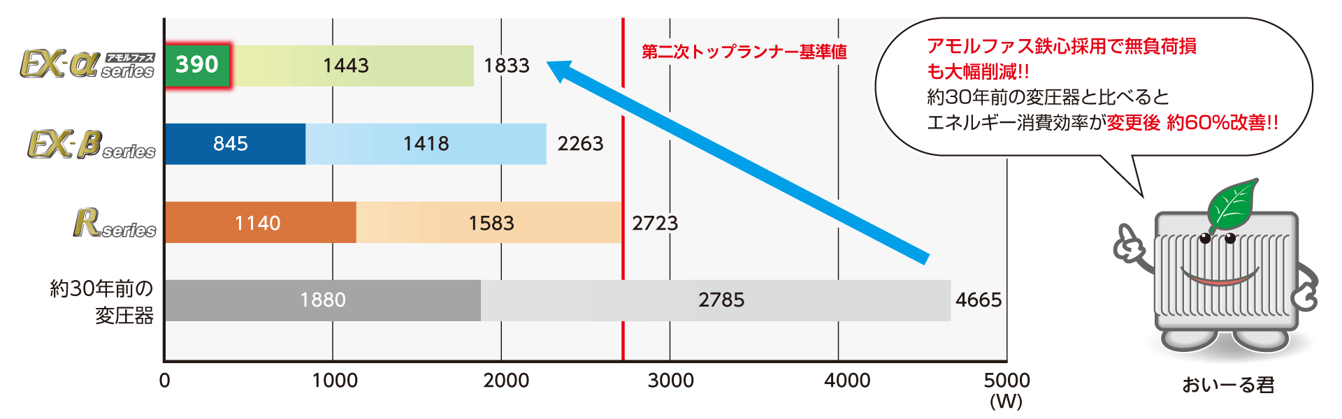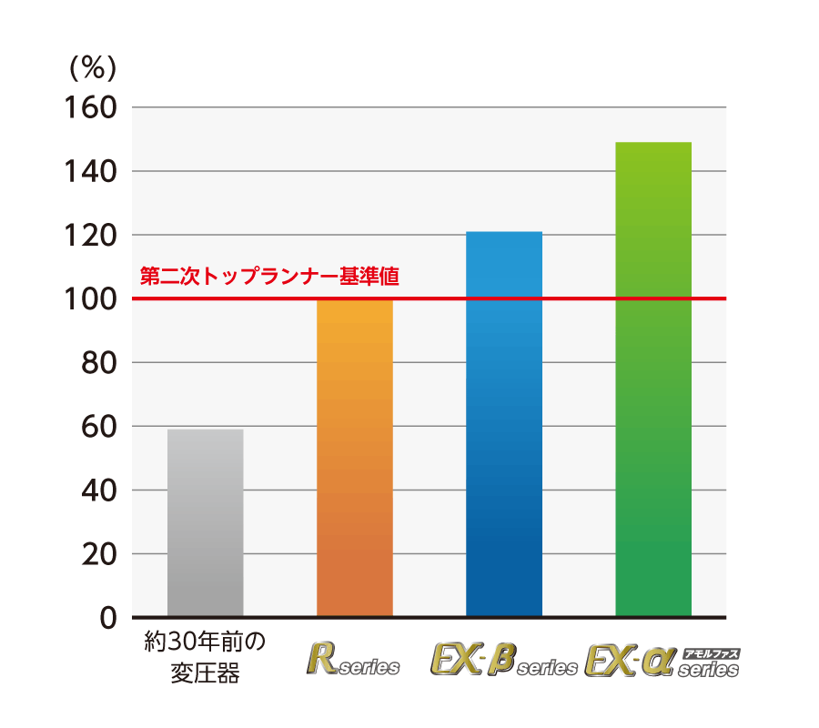スーパー高効率油入変圧器 EX-αシリーズはアモルファス鉄心を採用した最上位シリーズです。