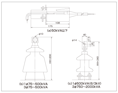 耐塩ブッシングの指定がある場合には、標準高圧ブッシング(6kV- 3kVタイトランスの場合は3kV側も含める)に代え下図の耐塩ブッシング(超重汚損用)を取付けます。