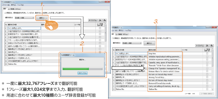 iQ Worksで作成するグローバルラベル、GX Works2・GX Works3、GT Works3などのラベル/コメ ント(単語、文章)などを複数まとめて翻訳(対応言語:日本語・英語・中国語)し、翻訳内容を反映できるソフトウェアです。