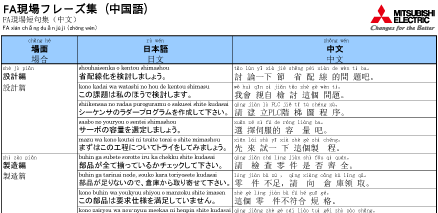 生産現場でよく用いられるフレーズを場面別(設計・製造・保守等)に整理し、FA現場フレーズ集に纏めました。現地スタッフとの中国語(簡体・繁体)、英語他でのスムーズなコミュニケーションの一助としてご利用ください。