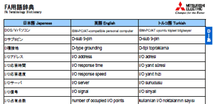 海外にご赴任、ご出張される方が現地の設計・製造現場で使える実践的なFA用語(4000語以上)を収録したFA用語辞典(日本語⇔英語⇔トルコ語他)をご用意しました。トルコ語、英語での現地スタッフとのコミュニケーションにご活用頂けます。