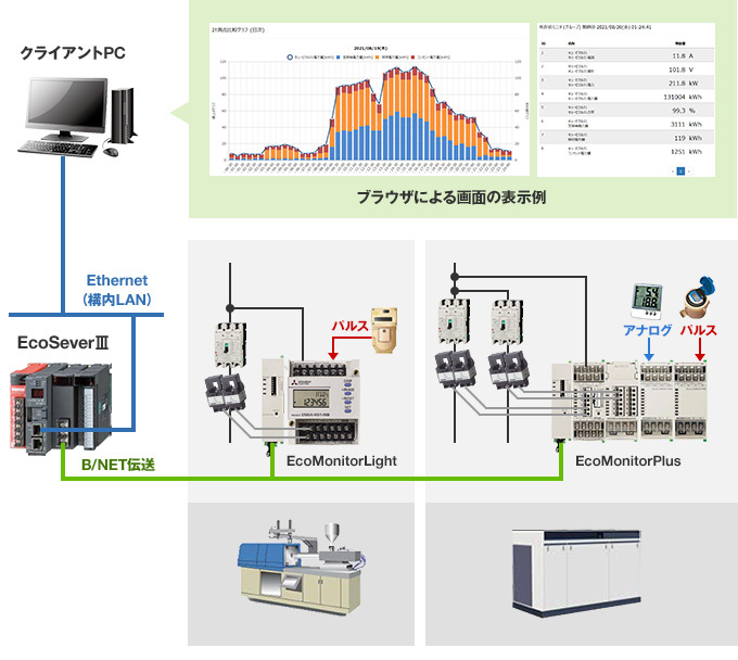 (2)省エネデータ収集サーバEcoServerⅢにより、EcoMonitorの計測データを収集、クライアントパソコンのブラウザにて、データ閲覧が可能。
