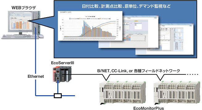 規模に合わせたシステム構築・拡張が容易な「エネルギー計測ユニット EcoMonitorPlus」によって、エネルギー情報の監視を行います。「省エネデータ収集サーバ EcoServerⅢ」と接続することで複数のEcoMonitorPlusの一括管理が可能です。設備、ラインの稼働状況をWEBブラウザ上で遠隔から監視し、設備の予防保全を実現します。