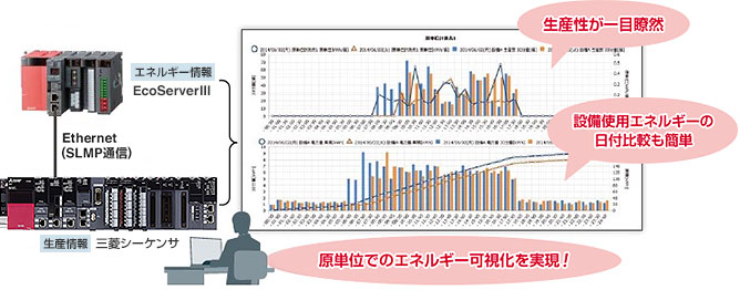 生産現場の設備やユーティリティ設備のエネルギー情報を、「省エネデータ収集サーバ EcoServerⅢ」によって可視化します。また、三菱シーケンサと連携することで、三菱シーケンサの持つ生産情報とEcoServerⅢの持つエネルギー情報を基に「原単位※管理」を実現。設備ごとの細かな改善活動につなげます。
