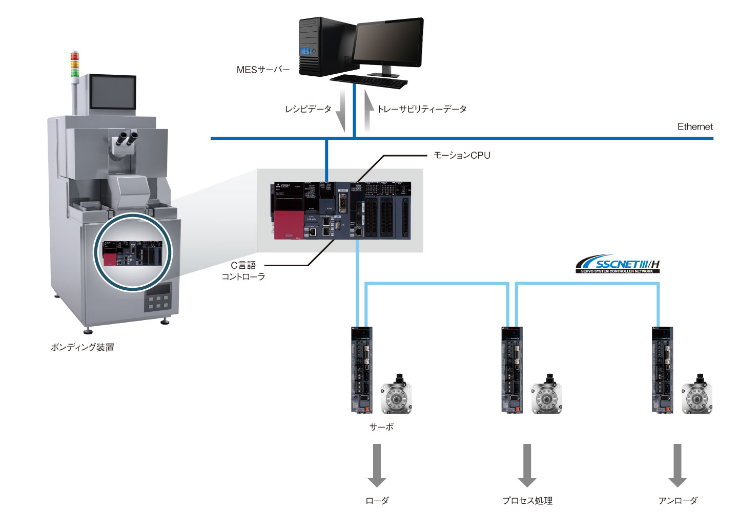 従来、ボンディング装置は制御プログラムをパソコンで実行して、ボンディング処理を実施していました。C言語コントローラを導入すると、カメラアライメント、ボンディング設定、計算ルーチンなどの複雑な制御を実行しながらボンディング処理を実行できます。制御プログラムをそのままC言語コントローラに移植できるため、プログラムの変更は必要ありません。また、0.88msでモーションCPUへ指令を出せるため、1チップあたりのサイクルタイムを短縮でき、お客様の製品生産量も増大します。部品の安定供給も保障されているため、メンテナンスのリスクも回避できます。