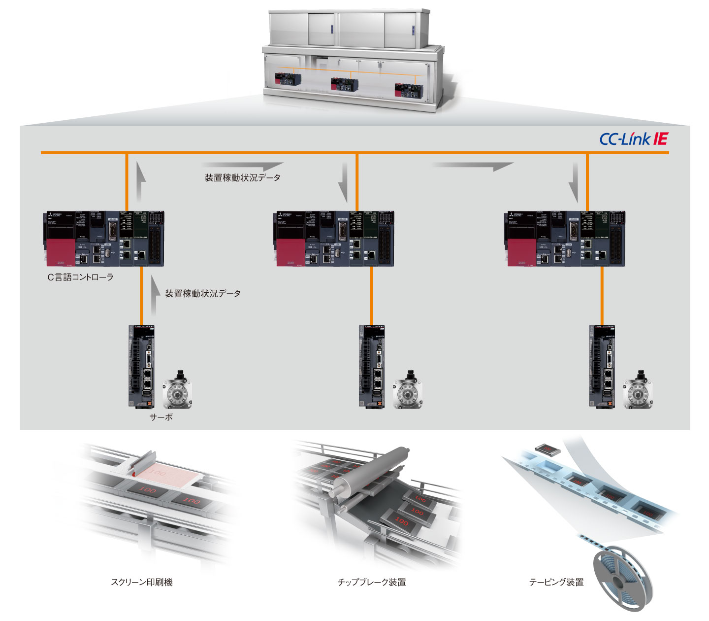 チップ抵抗器製造の各工程(スクリーン印刷、チップブレーク、テーピング)の装置稼動状況を、C言語コントローラ間でリアルタイムに同期できます。C言語コントローラ間で同期を行いながら、サーボモータの回転速度の演算および制御も実施できるため、装置の稼動率を30%向上できます。