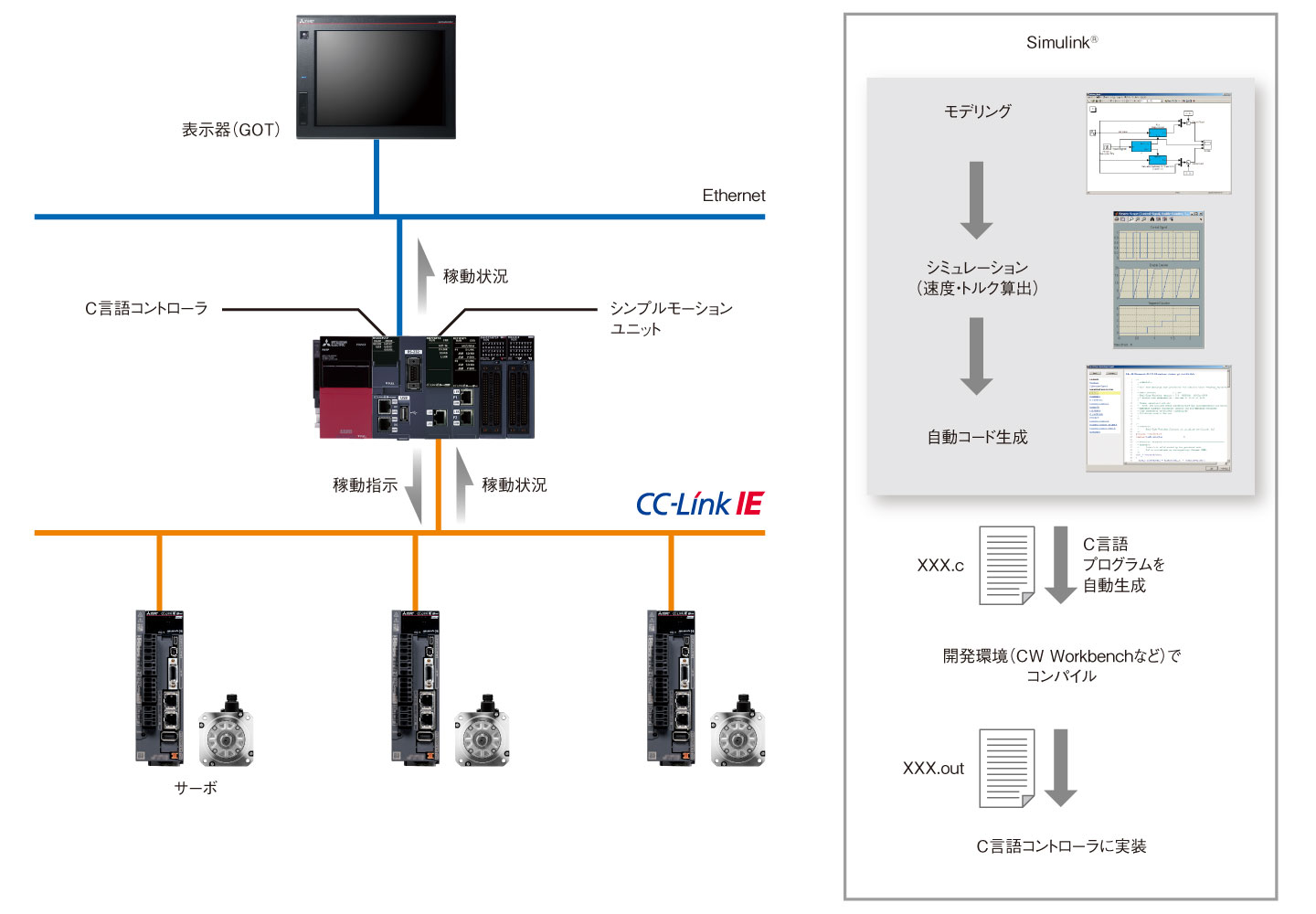 搬送先管理には、上位システムとの通信で指示された搬送先への最適な搬送経路算出、算出結果に合わせた搬送制御状態の取得、そして搬送制御指示が必要です。これを実行するためには、汎用性の高いC、C++言語でのデータ処理に加え、搬送制御機器との高速通信が必要であり、シーケンサCPU、シンプルモーションユニット、C言語コントローラの構成で実現できます。搬送システムでは表示器(GOT)を搬送機に装着し、上位システムとの通信が行えない状態でも搬送機の操作が可能です。これらのユニットは耐環境性に優れているため、制御盤内に表示器(GOT)とともに設置でき、省スペースを実現します。またMATLAB®/Simulink®によるモデルベース環境開発で、搬送制御に必要な速度・トルクなどを算出でき、高速な搬送を実現します。