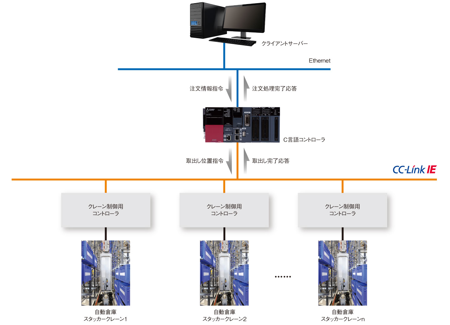 従来のシステムではプロセスコンピューター(プロコン)を使用して、生産情報、在庫情報、入出庫の管理を行い、その情報を自動倉庫コントローラに伝えて、スタッカークレーン、入出庫台車の制御などを行っていました。しかし、プロコンの連続稼動による故障でシステム復旧に時間とコストがかかっていました。このプロコンをC言語コントローラに置き換えることで、安定した連続稼動が可能です。また、大幅なメンテナンスコストの削減も実現します。