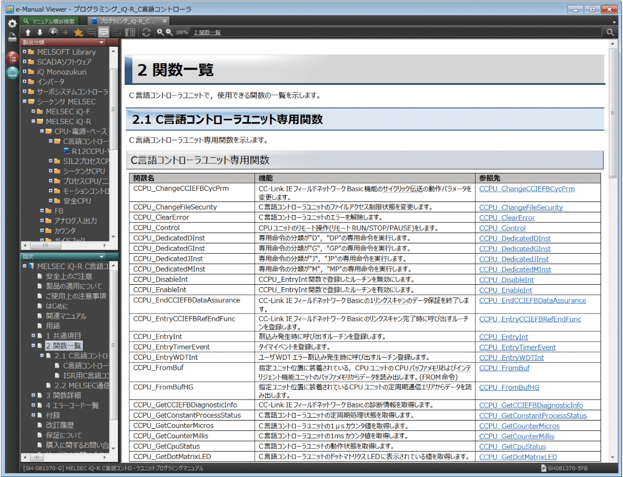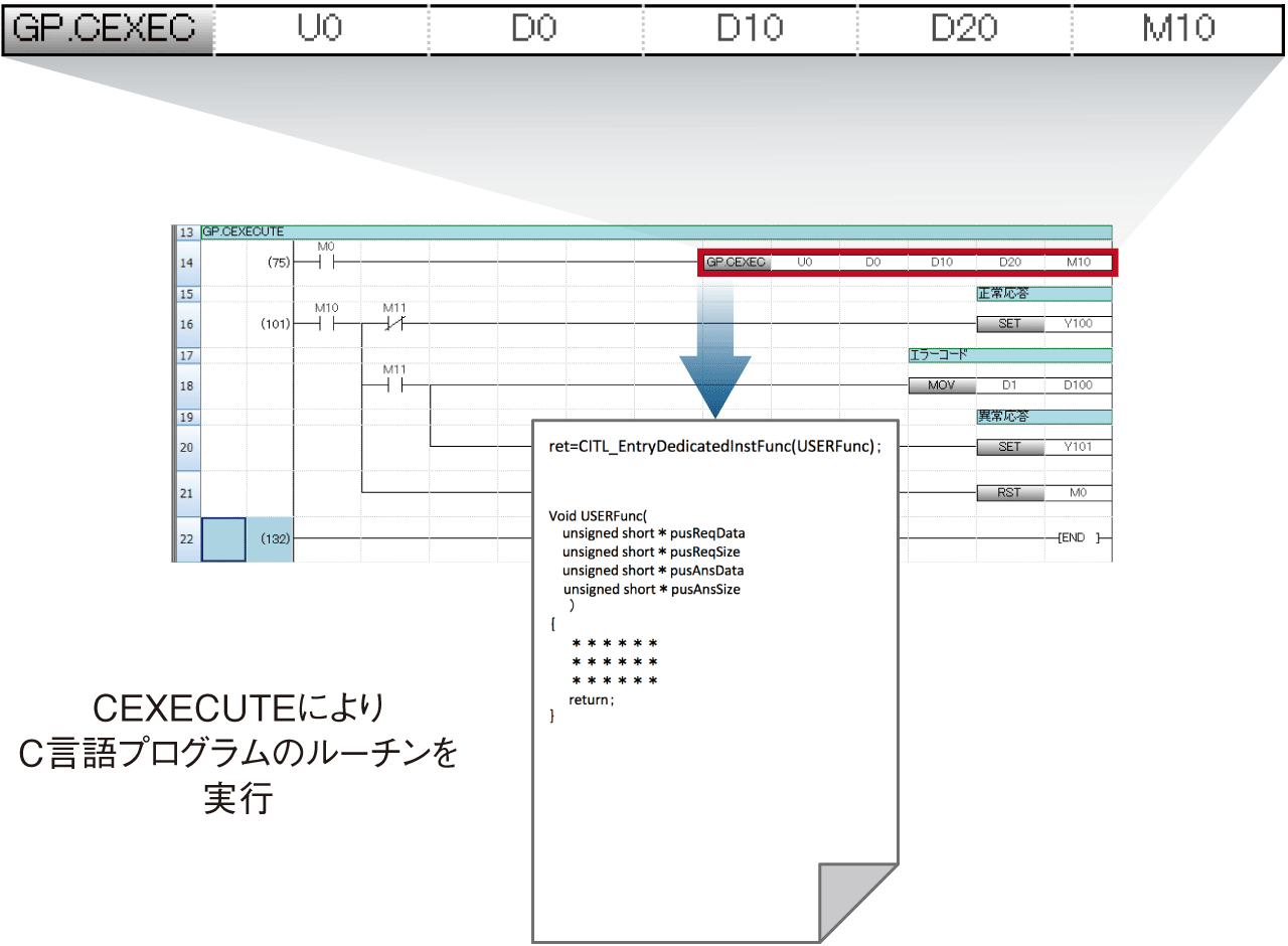 専用関数を使用することで、C言語コントローラ、I/Oユニット、インテリジェント機能ユニット、ネットワークユニット、シーケンサCPUやモーションCPUへのアクセスなど、シーケンサ機器を扱うアプリケーションを作成できます。関数は「CCPU/CITL関数」、「MD/MDR関数」の2種類があります。