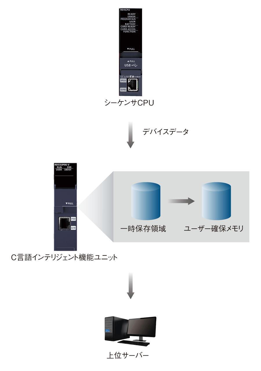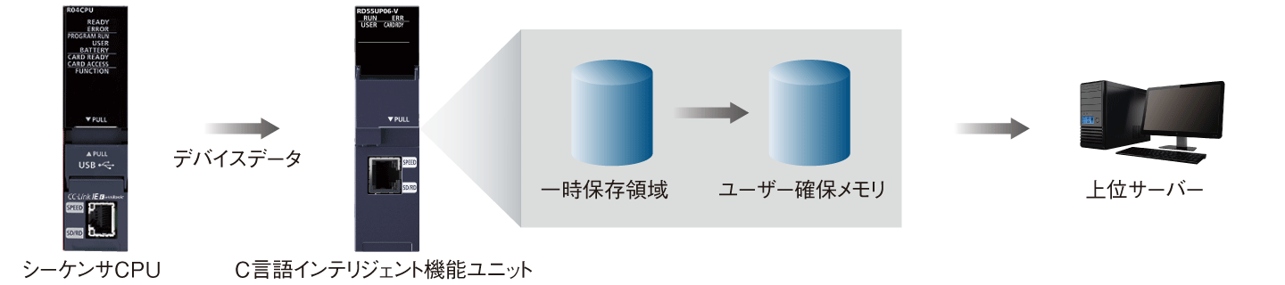 シーケンサCPUの毎シーケンススキャンのEND処理時に、事前に指定したデバイスデータをC言語インテリジェント機能ユニットに転送できます。一時保存領域に格納されたデータは、C言語インテリジェント機能ユニットの専用関数で取得でき、ユーザー確保メモリに転送されます。そのデータをSDメモリカードへ保存、または上位サーバーへ転送など任意のタイミングで実行できます。