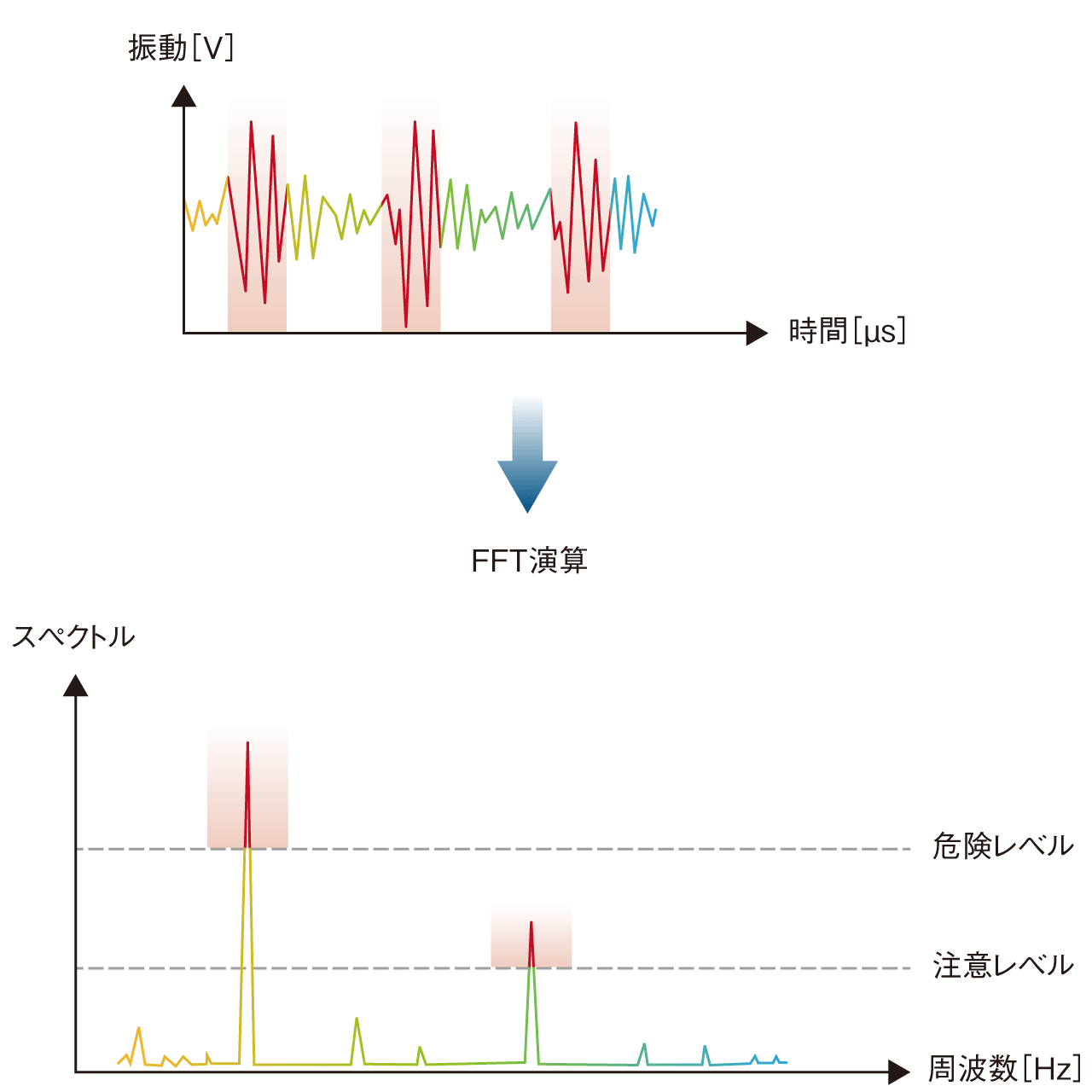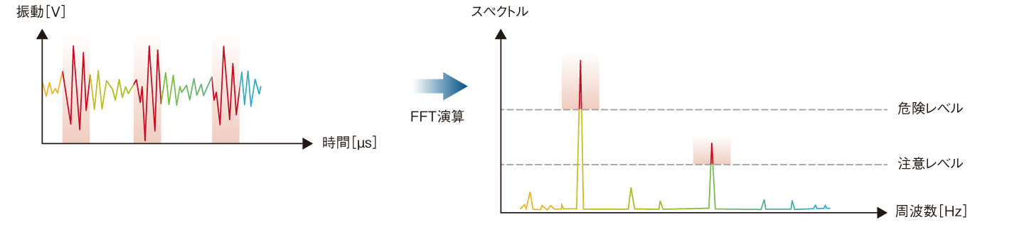 - *1.Fast Fourier Transform(高速フーリエ変換):収集データの中にどの周波数成分がどれだけ含まれているかを算出するために、時間軸のデータを周波数軸のデータに高速変換する処理のこと。