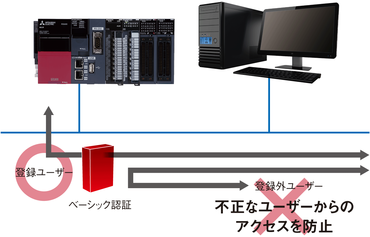 CW Configurator*1、GX Works3*2、FTP、Telnetで接続する際のログインユーザーの設定、アカウントのロックアウト*3が設定できます。また、ログインユーザーごとにアクセス権限(読出し/書込み/実行)を設定することで、ログインユーザーごとに管理者、現場オペレータといった役割を設定でき、不正アクセスを防止します。