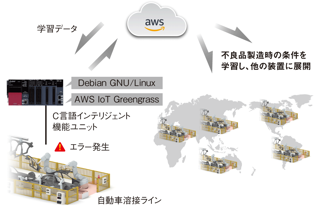 AWS IoT Greengrassを利用することで、クラウド上の大量の学習データをもとにモデルを作成し、異常はエッジで検出するシステムを構築できます。C言語インテリジェント機能ユニットと連携することで、高度なAIサービスを活用した予知保全システムを簡単に構築できます。これにより、メンテナンスコスト削減も実現します。