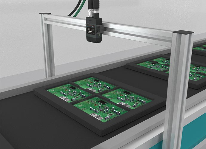 基板に印字されたコードを読み取り、ロットの管理、出荷後のトレースなどを行います。集計結果と在庫数から、生産数や生産進捗の管理が簡単にできるため、無駄が無くなり、生産性が向上します。