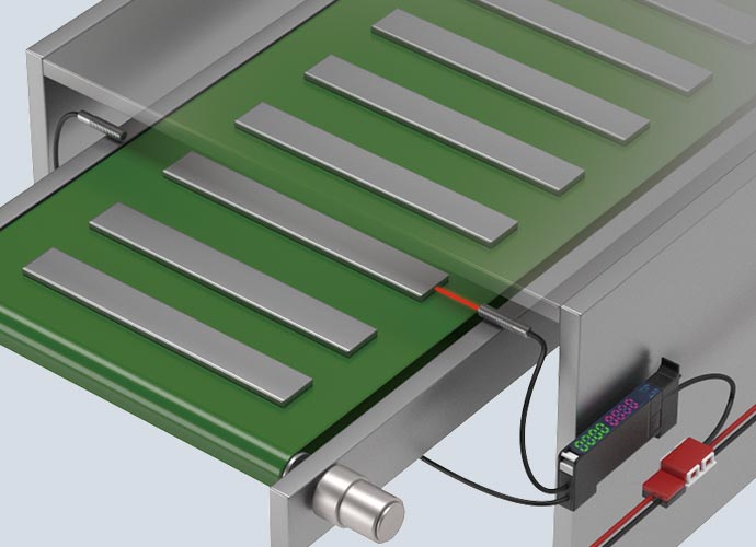 ファイバで、狭小部のワーク通過を検出します。1チャンネル単位で増設可能な省配線ファイバアンプにより、検出箇所が分散しても集中しても柔軟に対応します。ファイバヘッド投受光面の汚れや位置ズレが発生しても、センシングレベル監視で予防保全が可能です。