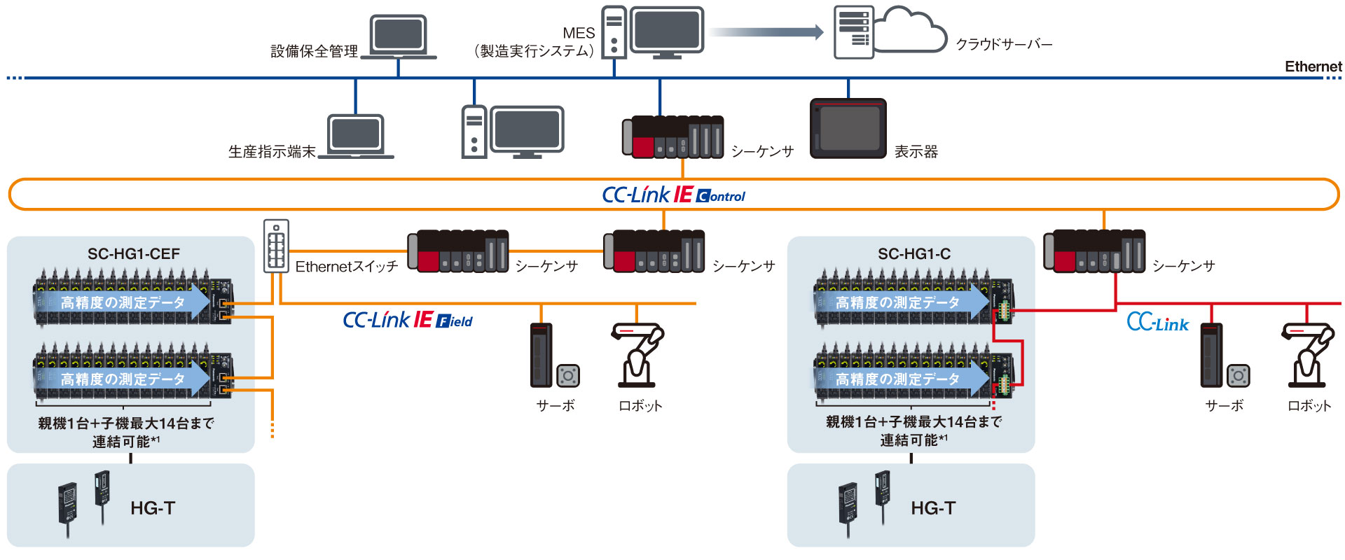 - デジタル変位センサ用CC-Link対応通信ユニットSC-HG1-Cを経由して、最大15台の変位センサ測定値を直接上位に転送(接触式変位センサHG-Sとの混在接続が可能)