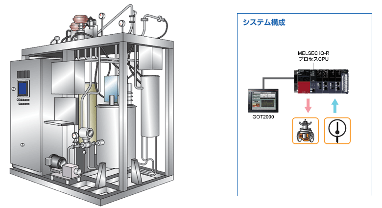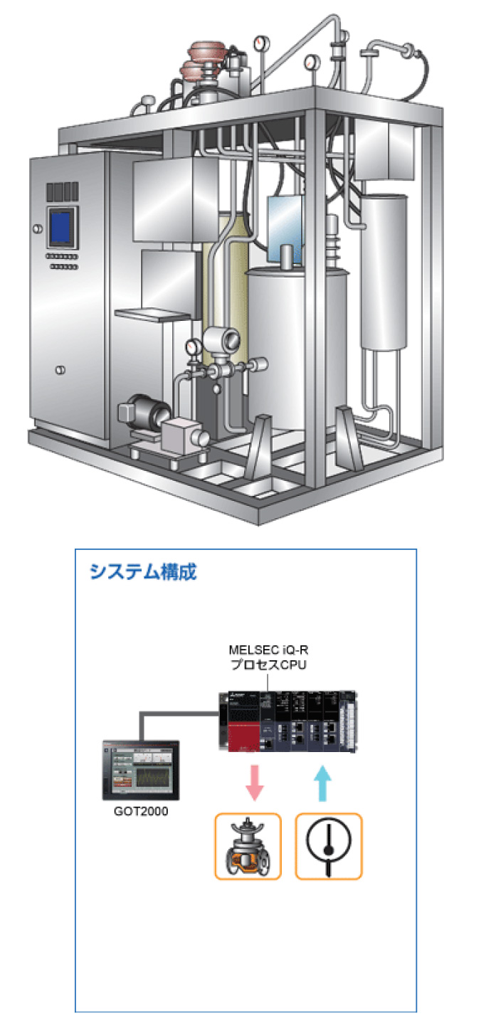 シーケンサと調節計で構成していた機能を1台のプロセスCPUに集約できます。 GOTとの組み合わせにより、操作性に優れた監視システムを構築すると共に、装置の小型化を実現します。