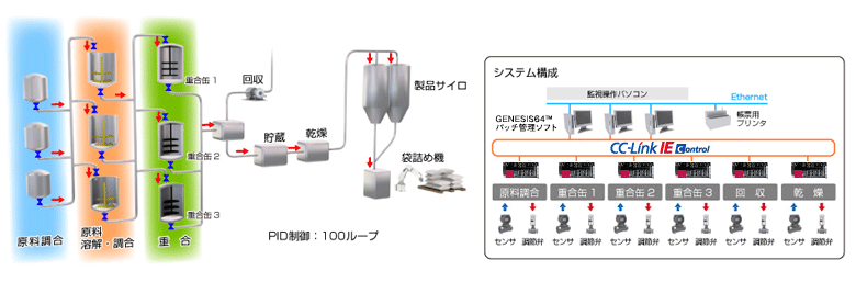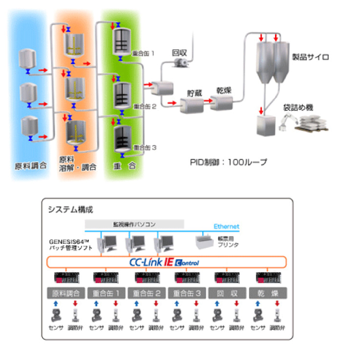小中規模のバッチ生産プロセスにおける処方管理・プロセス制御機能を、機能面およびコスト面で最適な汎用シーケンサと汎用パソコンの組み合わせにより実現しています。