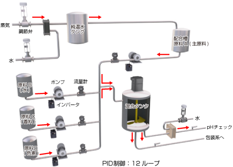 生産計画に合わせ上位パソコンおよびGOTより、原料A(主原料)の設定値、その他原料の比率を設定し、原料Aを基に原料B~Dの流量比率制御を行っています。原料の流量制御はインバータで行っており、純温水タンクの温調を行っています。