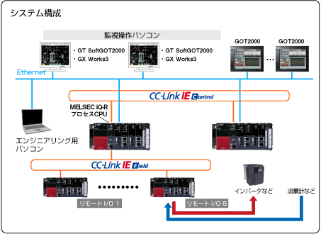 現場では耐環境性のあるGOT、監視室の監視パソコンではPX DeveloperモニタツールとGT SoftGOT2000との連携によりPID調整などの監視操作を行っています。GOT用の計装監視画面は、PX Developerモニタツールにて自動生成し、また同じ画面をGT SoftGOT2000でも活用しています。