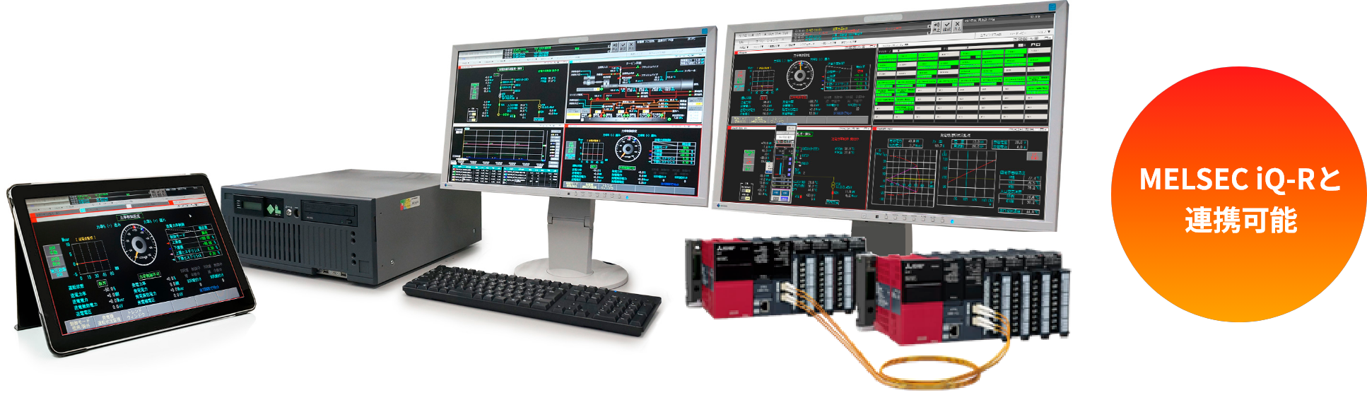 MELSEC iQ-Rとデータ連携することで、オペレータステーションと制御装置のシームレスなエンジニアリングが可能となり、コスト削減・品質向上・保守性向上に貢献します。