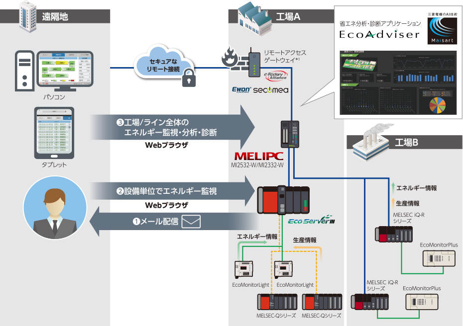 (3) 省エネ支援アプリケーションEcoAdviserで工場/ライン全体のエネルギー分析、診断結果を確認。