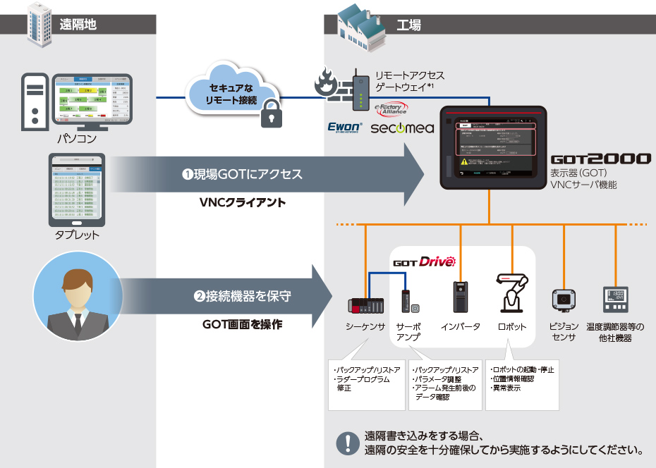 - GOTと各FA機器との連携を設定しておくことで、遠隔地からでもGOT上の情報確認やメンテナンスを実施可能。
