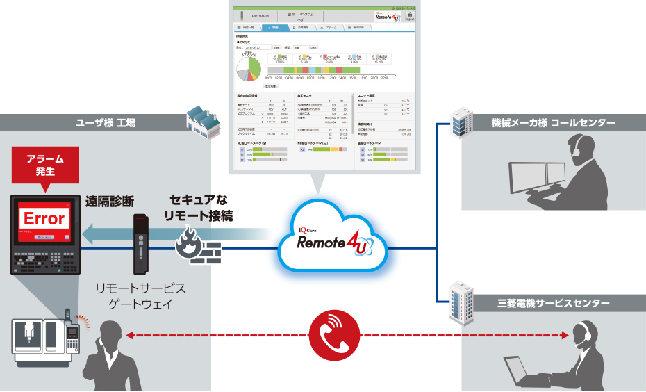 (1) iQ Care Remote4Uのプラットフォームにより、当社数値制御装置が搭載された機械に、リモートサービス機能を付加。