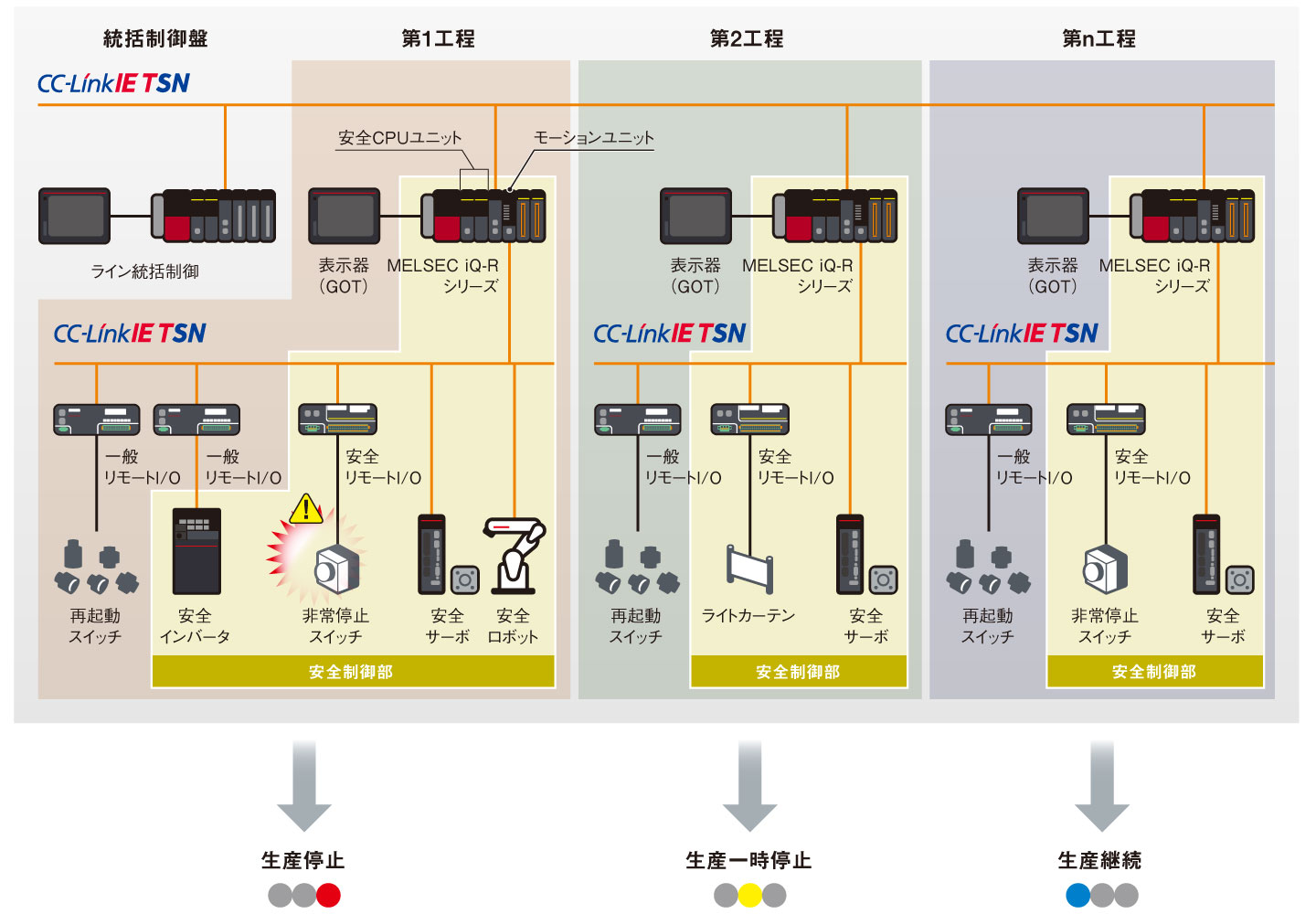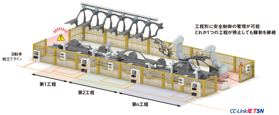 多数のロボットが動作する自動車組立てラインなどの大規模ライン・分散システムの安全を確保します。安全シーケンサ間の安全通信で、その前後の工程の安全シーケンサに停止信号を送ります。安全CPUユニットはCC-Link IE TSNで一般通信と安全通信を混在させて使用できます。またモーションユニットでは、CC-Link IE TSN経由でACサーボと安全通信ができます。そのため、CC-Link IE TSN1本で一般機器、安全機器、駆動機器と接続可能です。配線スペースの削減、拡張性の高いシステムの構築、TCOの削減なども実現できます。また、CC-Link IE TSNマスタ・ローカルユニットには最大120台の機器を接続できます。