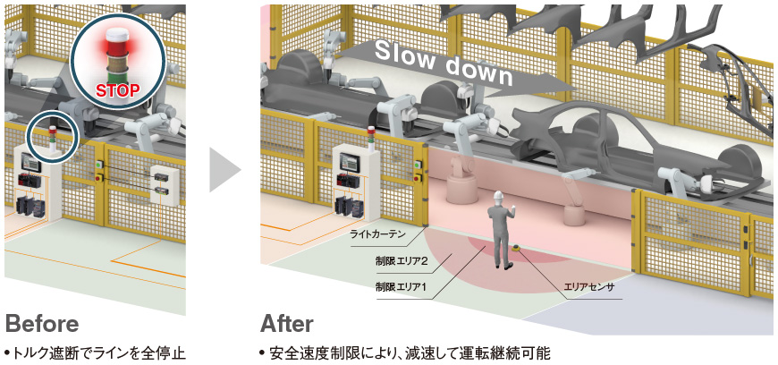 従来のラインでは、保守点検エリアに人が侵入した場合、トルク遮断(STO)でラインを停止させ、安全を担保していました。安全トータルソリューションでは、安全速度制限(SLS)により、制限エリアに作業者が侵入した場合、装置を停止させるのではなく、設定した周波数で運転を継続できます。
