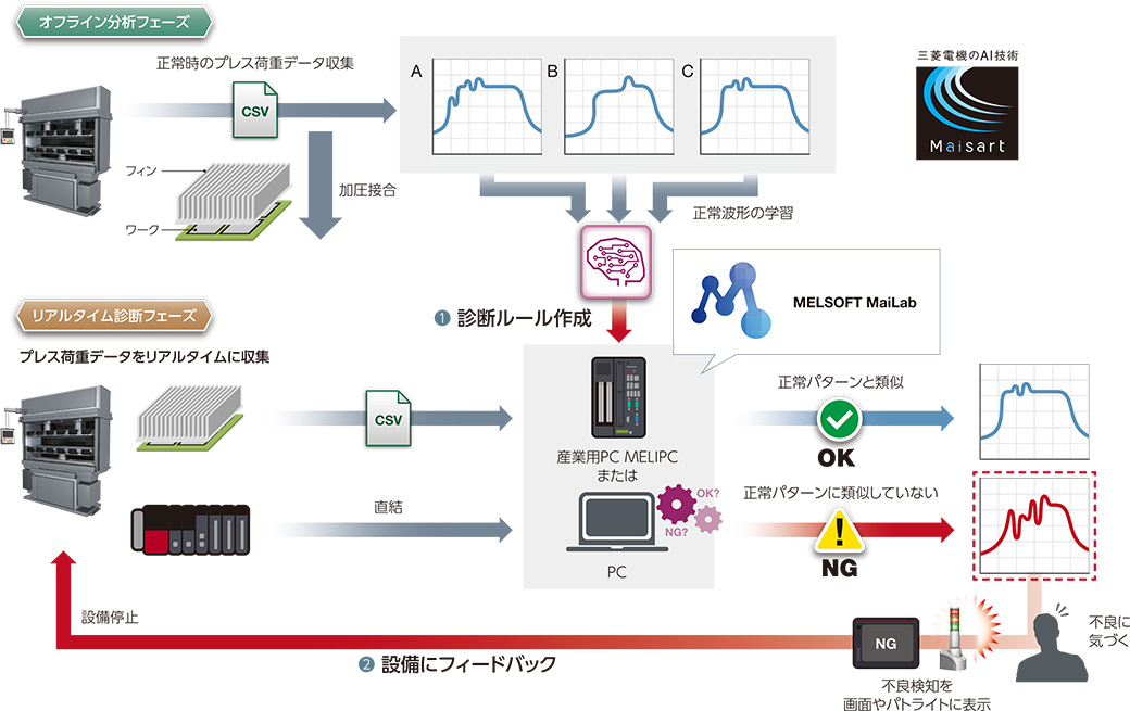 MELIPC によりプレス荷重データをリアルタイムに収集、MELSOFT MaiLab でルールに基づき診断することで、接合不良を検知し、設備へフィードバック(停止)します。