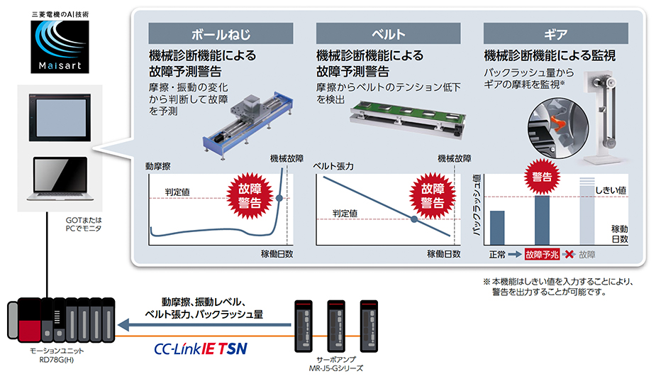 ギアのバックラッシュ量を推定し、ギアの摩擦劣化を監視。しきい値を超える場合に警告することで、故障を予測。