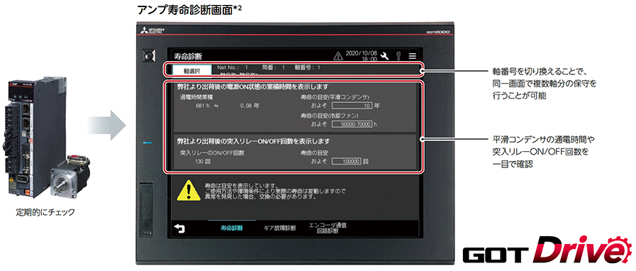 GOTのアンプ寿命診断機能を使うことで、平滑コンデンサの通電時間の累積や突入リレーのON/OFF回数をGOTで確認できるため、サーボアンプの交換時期を把握可能。