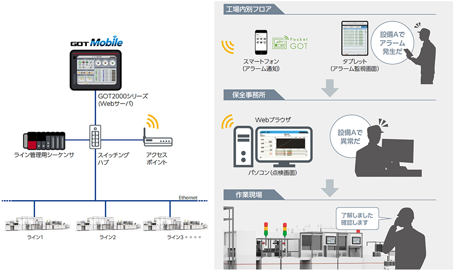 また、GOT用モバイルアプリPocket GOTを活用することで、監視対象のGOTで発生しているユーザーアラームをモバイル端末に通知できます。