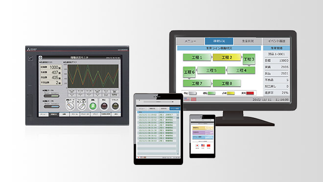 GOT Mobile機能により、遠隔地のパソコンやタブレットなどの情報機器から、現場のGOTが収集した情報を閲覧可能です。工場内に設置されている複数ラインの稼働状況やエラー発生状況など、現場に行かなくても遠隔監視ができます。
