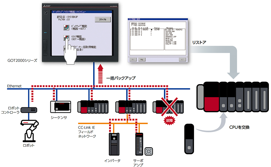 あらかじめバックアップをとっておくことで、FA機器の故障時、パソコンレスで現場のGOTからFA機器のリストア作業が可能となり、ダウンタイムを短縮