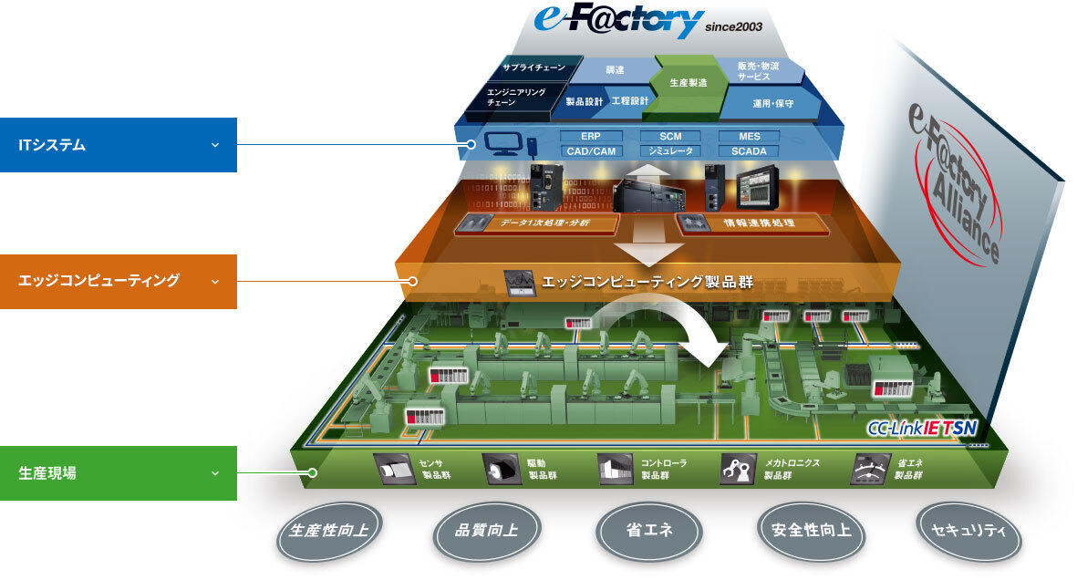 e-F@ctoryのアーキテクチャは、「生産現場」、「ITシステム」、およびそれらを連携するための「エッジコンピューティング」の3階層に分かれています。