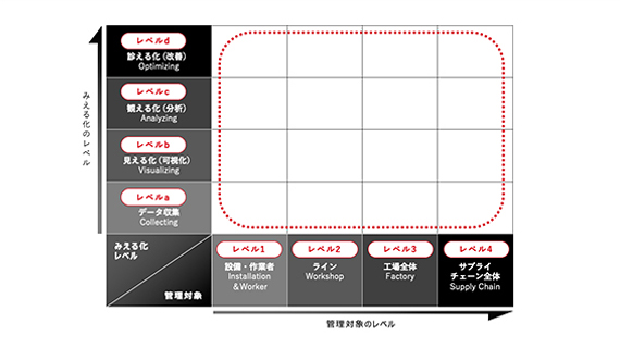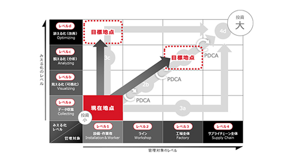 三菱電機では、SMKLを活用して製造現場のe-F@ctoryの推進レベルを評価し、製造現場の改善計画を策定しています。