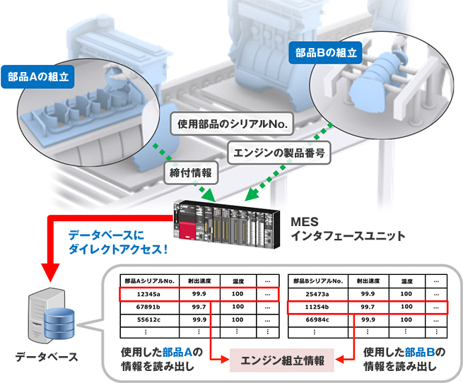 | 部品シリアルNo.、工程・設備履歴情報をデータベースに保存し、トレーサビリティを強化したい | MESインタフェースユニットで収集したエンジン組立情報と各部品の情報をデータベース連携 |
