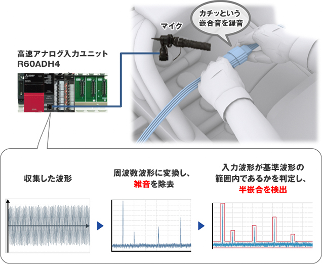 | コネクタの半嵌合による製品の品質低下を防止し、品質の向上を実現したい | 嵌合時の音を高速アナログ入力ユニットで収集してシーケンサでFFT解析 |