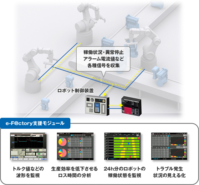 | ロボットの稼働状況を監視して、トラブルの予防保全を実現したい | ロボットの稼働状況をe-F@ctory支援モジュールで見える化 |