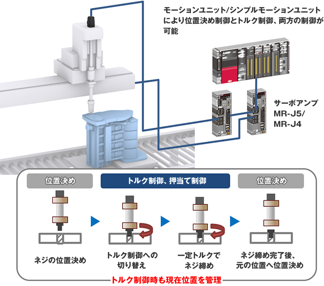 - モーションユニット/シンプルモーションユニットの押当て制御により、位置制御を停止することなくスムーズにトルク制御に切り換えることができます。