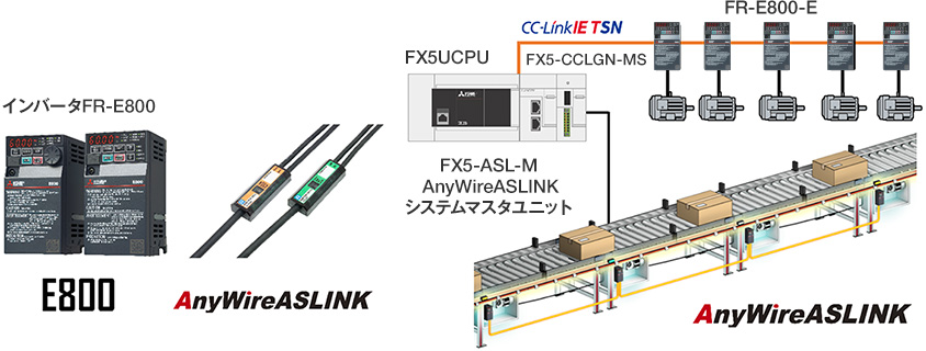 | 簡単操作、任意の可変速運転 | FR-E800とCC-Link IE TSNのネットワークによる多軸同時変速、生産現場のデータをリアルタイム収集 |