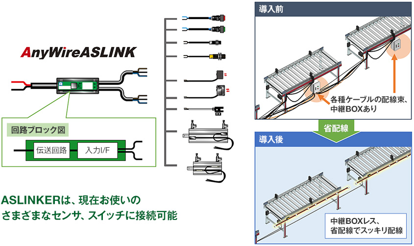 少点数,多分散のAnyWire ASLINKERの導入により、省配線かつ中継BOXレス化に貢献します。