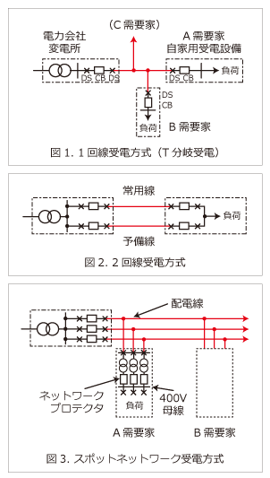 受電回路方式は、受電設備容量、施設の重要度、電力会社の供給条件や立地条件などによって決定され、6kV級では経済性に重点をおき、1回線受電方式 (T分岐受電) が多く用いられております。