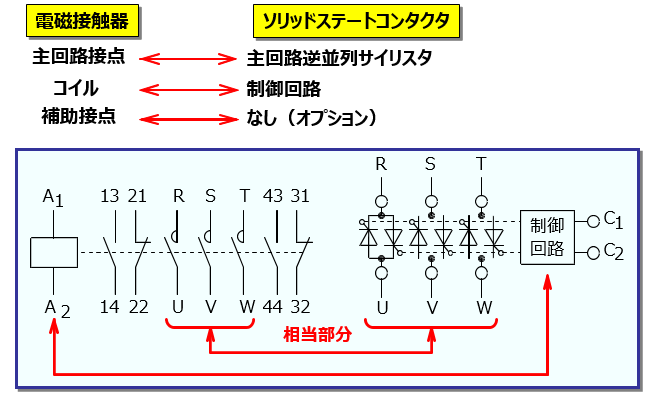 ソリッドステートコンタクタ(無接点コンタクタ)は逆並列サイリスタ回路又はトライアックを使用し、負荷電流のON/OFF制御をする半導体スイッチです。